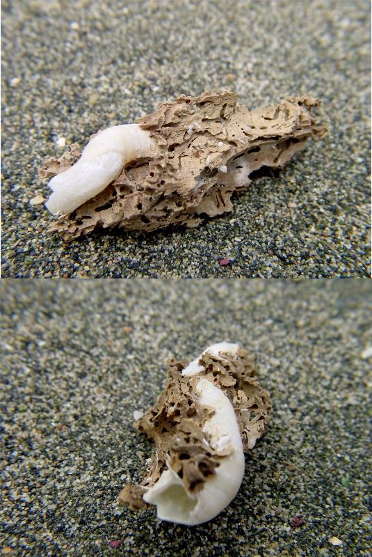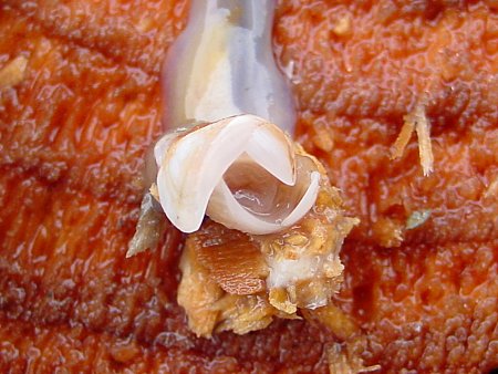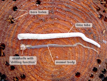 Teredo navalis Il grande distruttore di navi e porti in legno è un bivalve del tutto particolare. Scava il legno costruendo un lungo tubo calcareo per proteggere la parti molli ed i sifoni. La conchiglia in realtà è molto piccola, leggera, di forma triangolare, interna al tubo. |