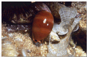 Natica millepunctata conchiglia carnivora di medie e piccole dimensioni, liscia e chiara. E' in grado, attraverso la secrezione di un acido, di perforare altri G. e bivalvi per nutrirsi della loro carne (spesso le conchiglie morte che si trovano sott'acqua, hanno un forellino circolare). Si incontrano di frequente sulla sabbia le sue uova a forma di castelletto di colore bianco. Altri G. carnivori "trapanano" la conchiglia delle loro vittime oppure le aprono facendo leva con la loro stessa conchiglia. |